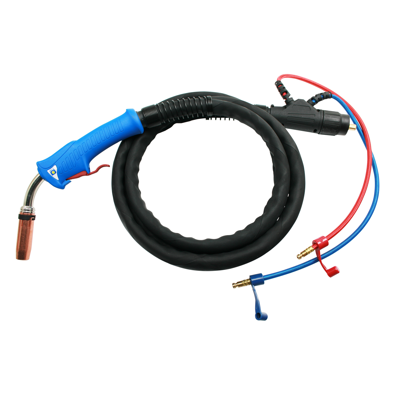 Wassergekühlter Schutzgasbrenner mit ergonomischem Handgriff, Kugelgelenk mit Knickschutzfeder, verlängertem Taster, Schnellverschlussring und Euro-Zentralanschluss mit feststehenden Kontaktpins.